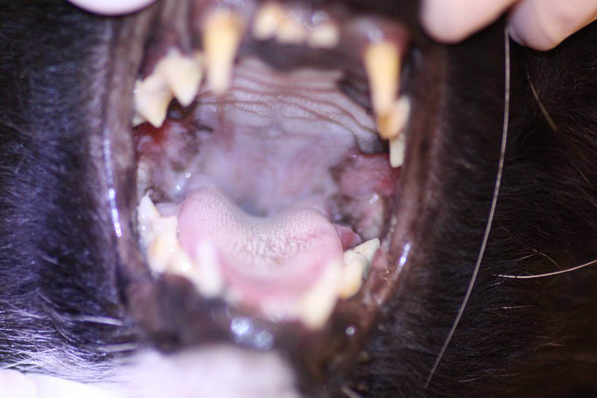 Запущенный гингивит можно определить без посещения врача. На деснах и небе у питомца видны кровоточащие язвы, из пасти исходит неприятный зловонный запах. При развитии пародонтита и пародонтоза животное не может самостоятельно закрывать рот и пережевывать пищу.
