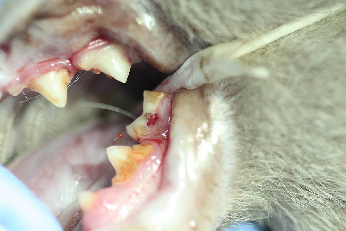 - Даже самые небольшие царапины дёсен (травма вследствие употребления грубого корма, попадания рыбной косточки или драки с соседским котом) приводят к серьёзным последствиям в виде гингивита и пародонтоза.
