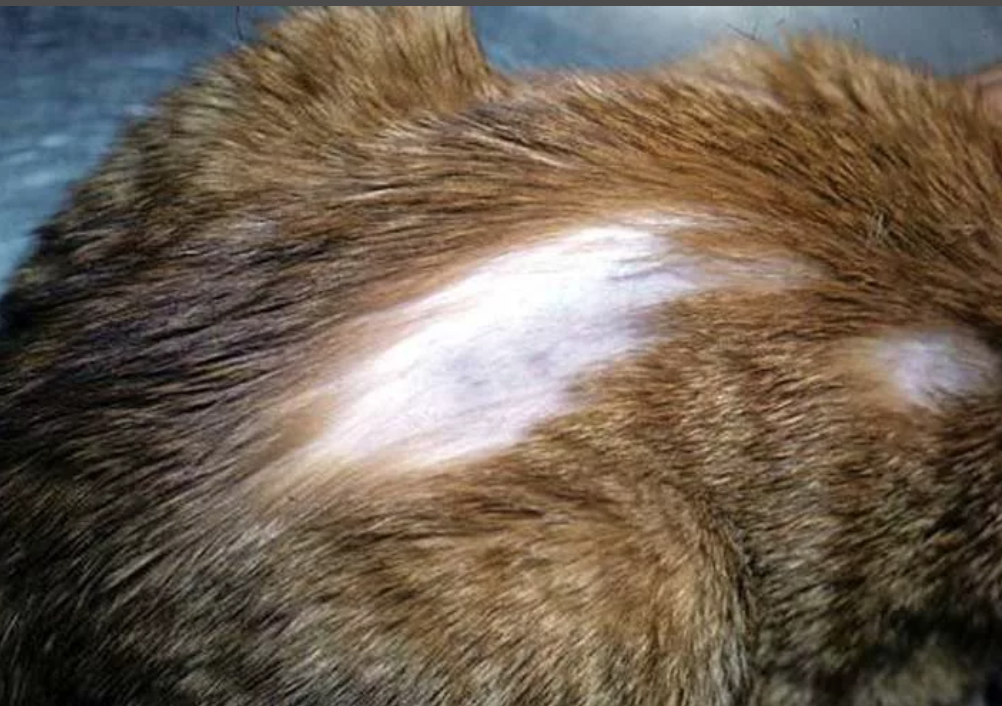 - Дерматофитозы: микроспория начинается с появления маленьких очажков облысения на морде у питомцев с ослабленным иммунитетом. При ненадлежащем лечении либо его отсутствии площадь поражения расширяется, появляются новые безволосые участки. Алопеции могут возникнуть при поствакцинальном осложнении, если животное находится в инкубационном периоде заражения.