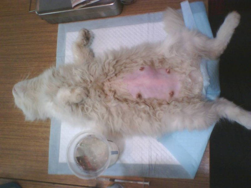 Для проведения оперативного вмешательства необходимо удостовериться, что у кошки доброкачественная опухоль. Перед вмешательством оценивают общее состояние животного. Старых кошек не оперируют, поскольку высока вероятность, что питомец не перенесет наркоз. Помимо удаления молочных желез вырезают матку с яичниками.