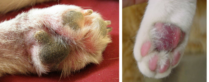Когда на подушечках или между пальцев обнаруживают уплотнения или новообразования, следует обратиться за ветеринарной помощью.