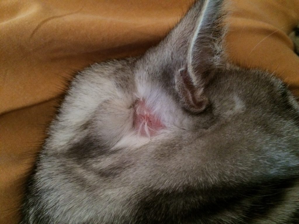 Дерматит, который может возникать на любых участках тела животного, в том числе и в ушах. При этом кошка не только трясет головой, но и активно чешется, а на поверхности ушей образуются мокнущие язвы.