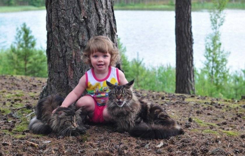 Эти кошки очень ласковые. Нашей младшей дочери три года, и она чуть ли не в узел завязывает кошачий хвост – мейн-куну это только в радость.