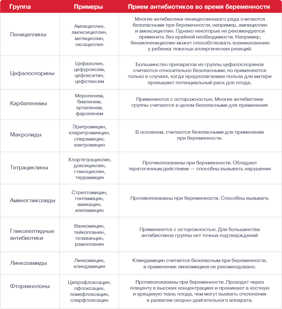 В таблице ниже мы собрали данные о самых распространенных группах антибиотиков и их возможном влиянии на плод.