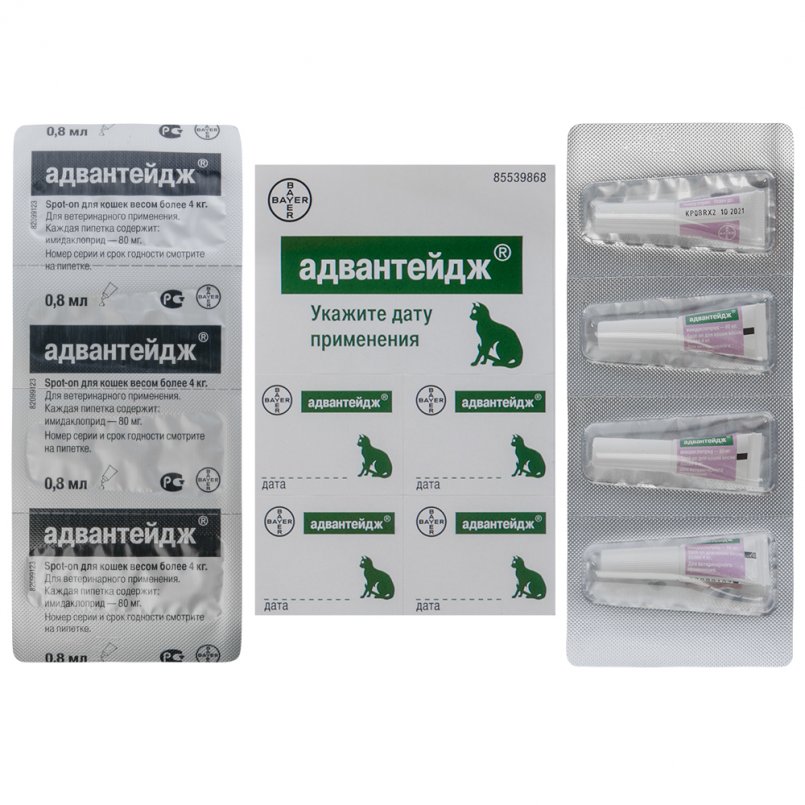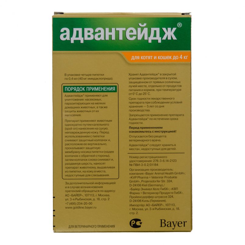 Выпускается препарат Адвантейдж в виде жидкости желтого цвета. Фасуют в тюбики-пипетки с указанием дозировки уже готовые к применению. В одной упаковке содержится 4 тюбика-пипетки, в каждом 0,4 мл средства. В связи с высокой стоимостью препарат продают поштучно. Срок хранения капель с даты изготовления 5 лет. Отдельно выпускают средство для котят и кошек весом меньше 4 кг. Препарат отличается меньшей концентрацией активного вещества. На упаковке Advantage имеется соответствующее указание. Капли для кошек весом более 4 кг можно применять для уничтожения блох на собаках.