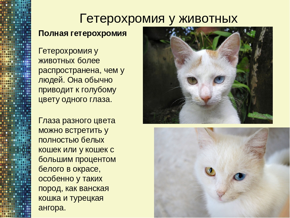 Гетерохромия — аномалия, которая не является заболеванием. Оболочка глаз различного цвета ни что иное, как генетическая особенность животного. Как правило, такой особенностью обладают кошки белого цвета.