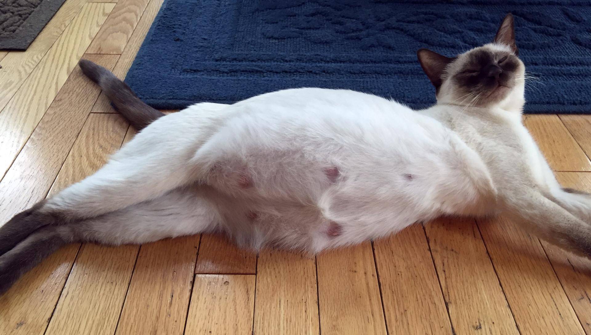 На последней неделе вынашивания плодов происходит набухание молочных желез, и кошечка становится неактивной и выглядит задумчивой.