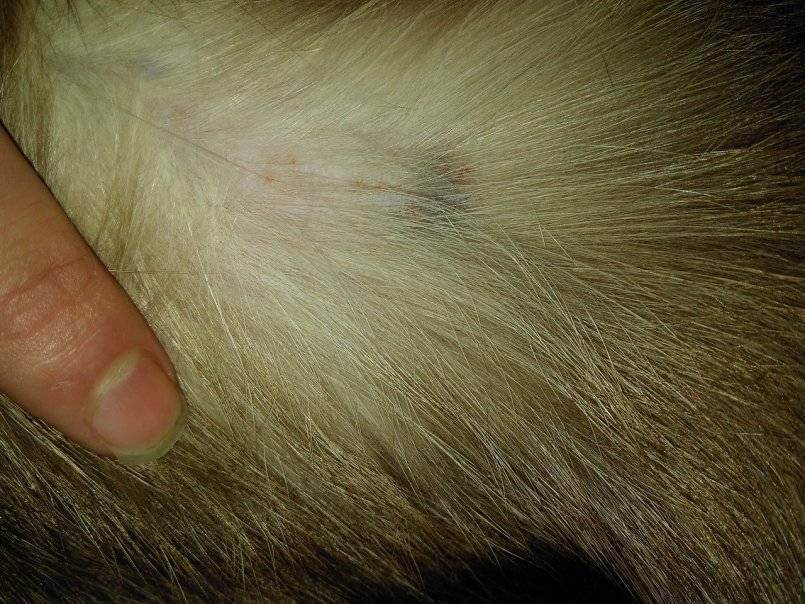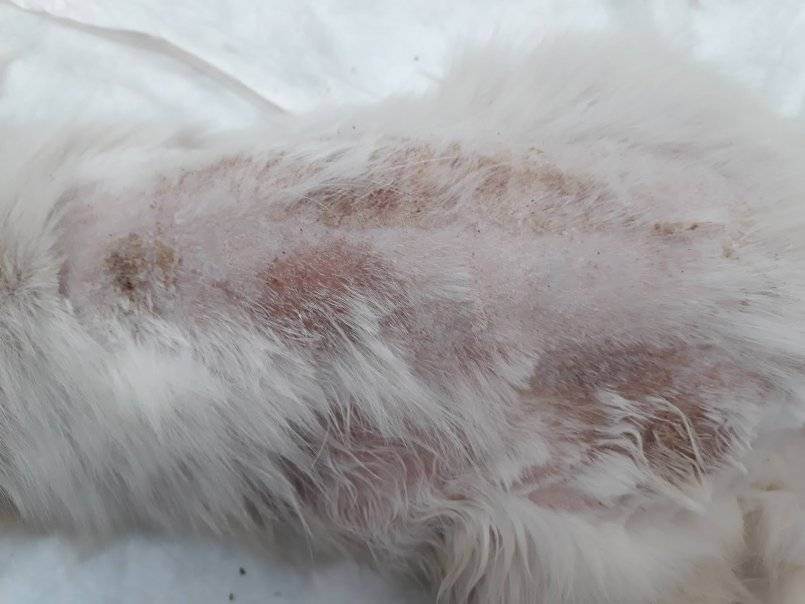 При осмотре кожи обнаруживаются корочки и мокнущие эрозии у основания хвоста, на спине, шее, груди, за ушами. По всему телу заметны высыпания, покраснения, шелушения. При визуальном осмотре можно выявить внешних паразитов (блохи, вши).
