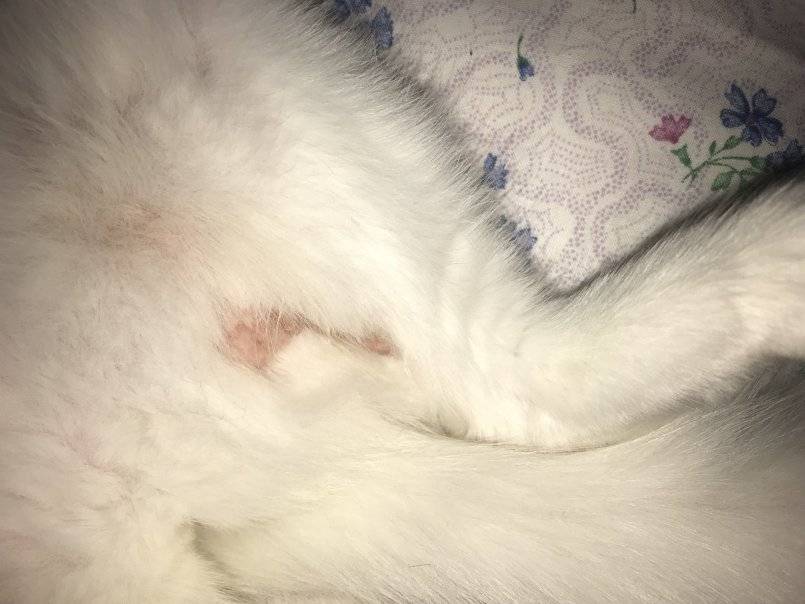 Кошка расчесывает область подбородка, шеи, низ живота. Нередко зуд наблюдается в области анального отверстия и на подушечках лап.