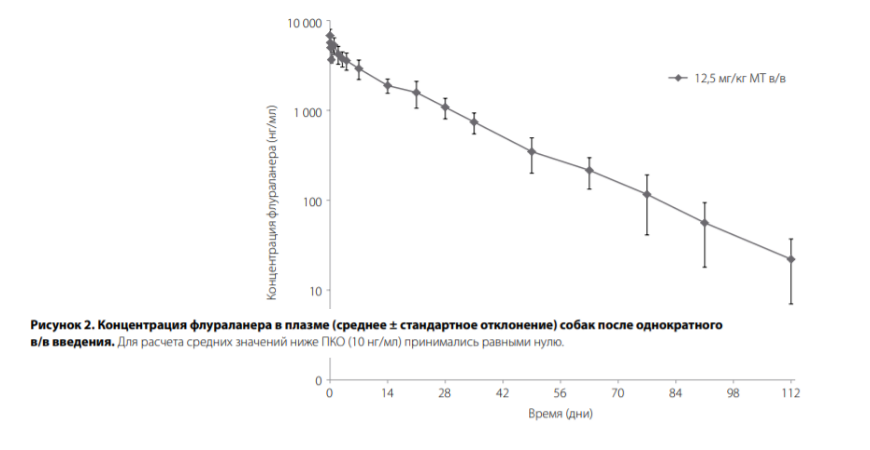 На рисунках представлена концентрация действующего вещества (флураланера) в плазме после однократного перорального введения (рис. 1) или внутривенного введения (рис. 2)
