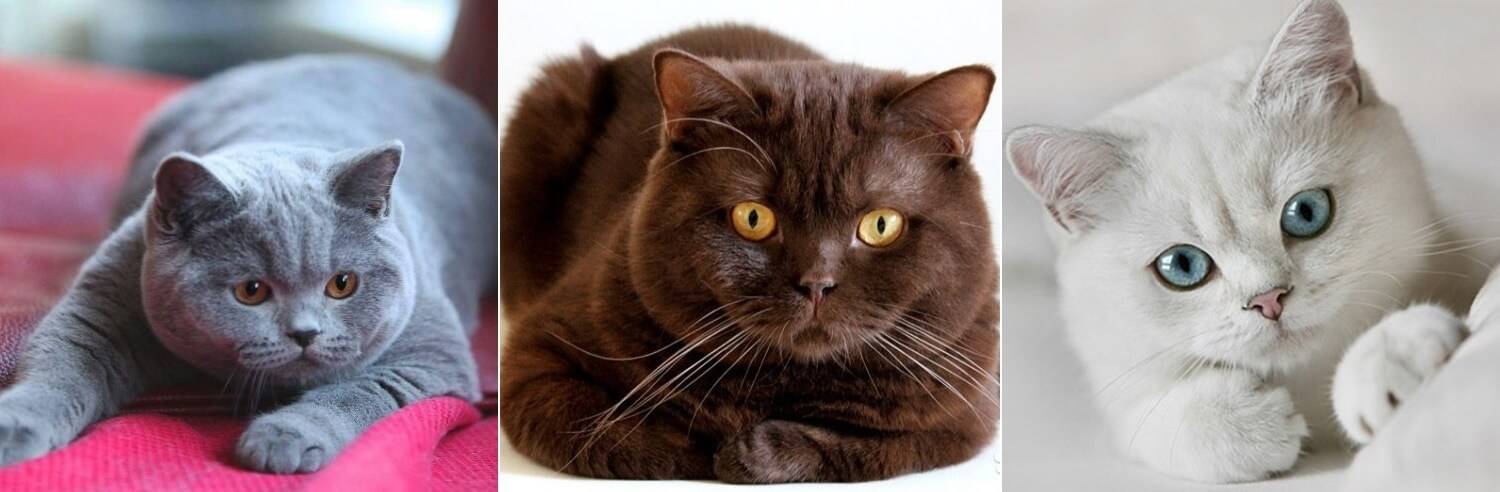 На фото Британская короткошёрстная кошка окрасов: голубой, шоколадный, белый