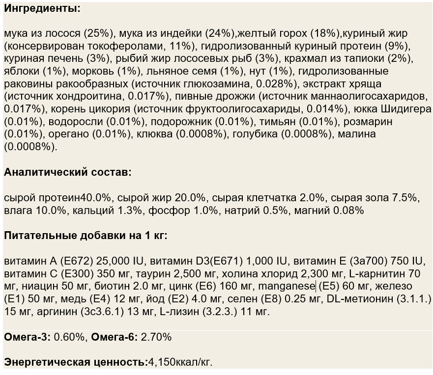 Главный источник животного протеина – мука из лосося и индейки. Заметное место в структуре кормосмеси занимают гидролизованный куриный протеин и печень – 9 и 3%. Суммарная доля животных компонентов превысила 60%.