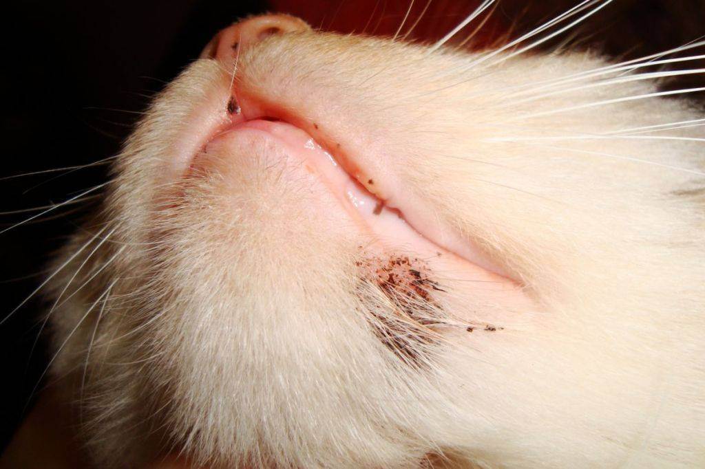 Кошка часто чешет подбородок, тем самым занося вторичную инфекцию и травмируя больное место.