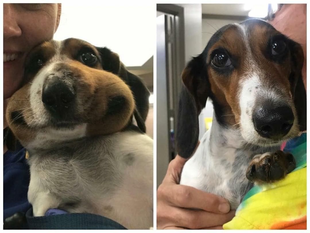 Отек морды после укуса гадюки слева. Справа та же собака через сутки.