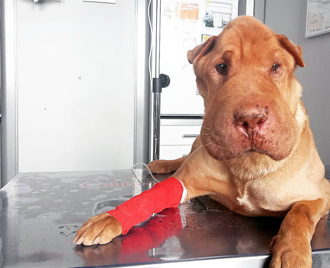 Если укус пришелся в лапу, накладывают бинтовую повязку, но очень важно не нарушить кровоток в конечности