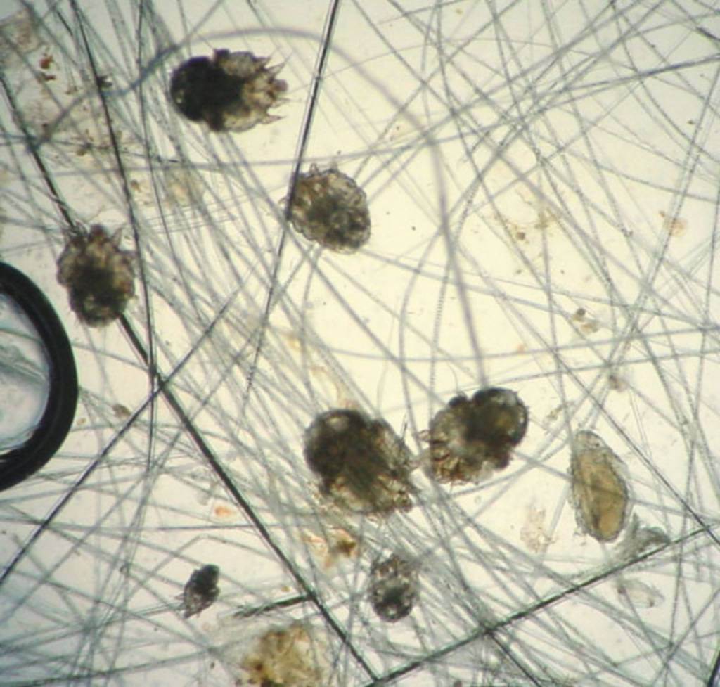 Demodex canis – сигаровидный паразит светло-серого цвета. Длина его корпуса – 0,2-0,3 мм. В отличие от других возбудителей, он живет в сальных железах и волосяных фолликулах с момента рождения животного. Развитие демодекоза происходит при резком падении иммунитета.