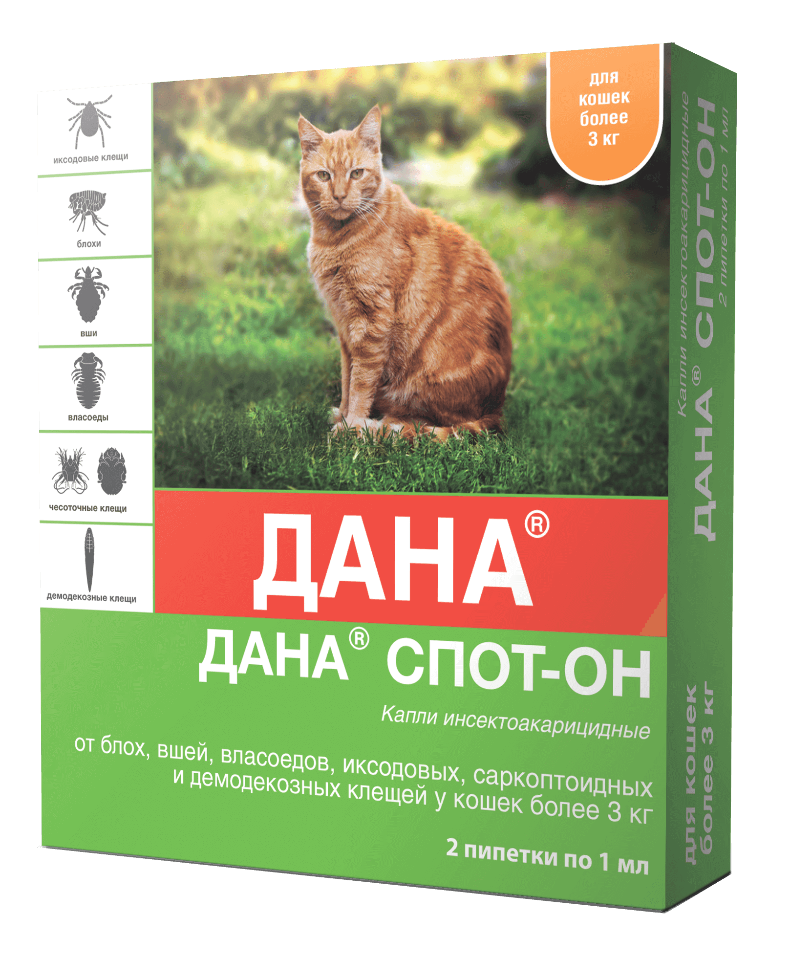 Дана-каплями для кошек обработку проводят 1 раз в месяц.