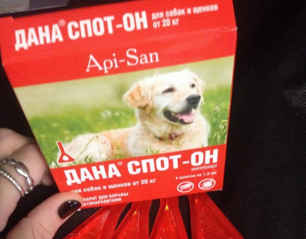 Согласно инструкции, капли Дана и Спот-он, и Ультра нужно наносить собакам в область холки. На крупных питомцев капли можно наносить и вдоль позвоночника, но так, чтобы животное не могло его слизать. Наносить капли разрешено только на сухую и не поврежденную кожу.