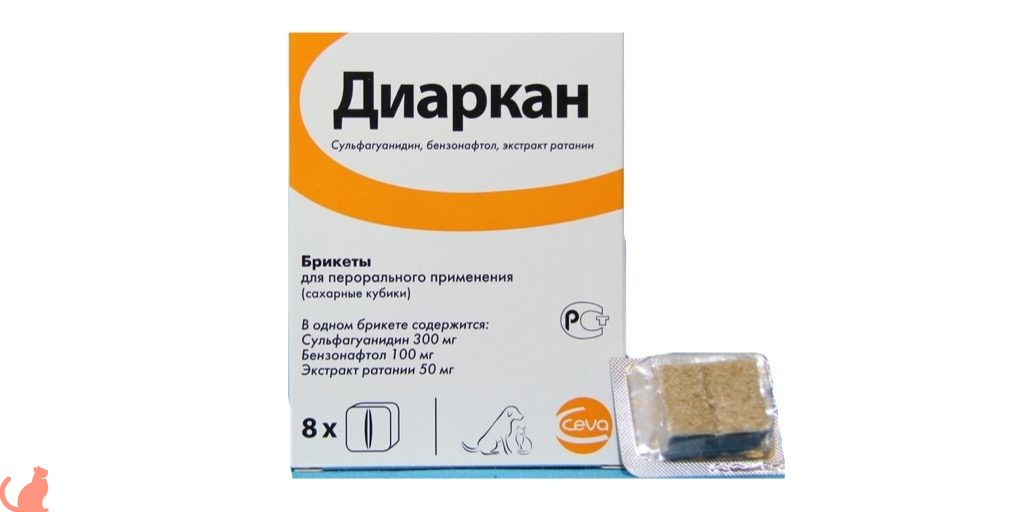 Данный препарат выпускается в виде сахарных кубиков, что очень удобно для дачи его в процессе кормления животного. Он медленно всасывается в кишечнике у кошек, что обеспечивает его длительное воздействие на патогенные микроорганизмы. Экстракт жидкой ратании, входящий в состав диаркана, образует пленку на слизистой оболочке кишечника. Он защищает и способствует восстановлению водно-солевого баланса в кишечнике. Также пленка предотвращает попадание в организм токсинов от патогенных бактерий.