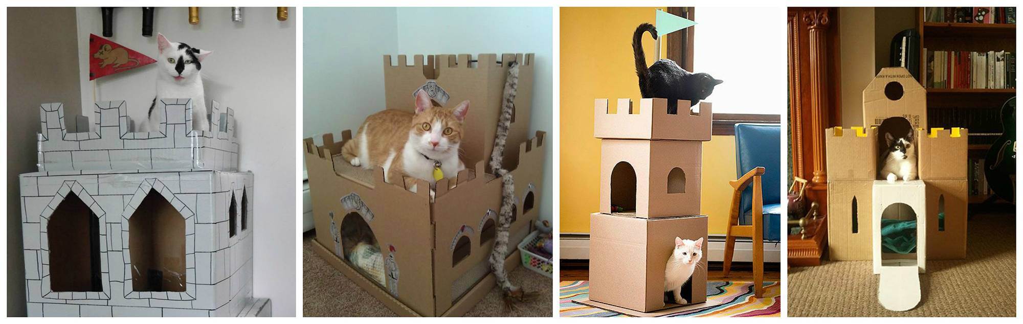 Жилище может быть не только стандартной квадратной формы. Это и вигвам, и избушка, и даже круглый домик. Умельцы создают целые лабиринты из картона, многоярусные сооружения или игровые комплексы. Можно соединить коробки разного размера, взяв большие коробки для основания, а поменьше – для площадок и уровней. Придумайте интересный дизайн, используя тесьму, ленты, фурнитуру. Сделайте домик для кошки из коробки в цветах вашего интерьера.