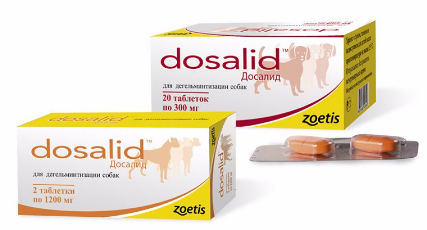 Препарат «Досалид» (Dosalid) используют для дегельминтизации собак. Он уничтожает паразитов на любых стадиях развития. Препарат выпускается в виде таблеток в двух вариантах: весом 300 мг (коричневые таблетки) и весом 1200 мг (оранжевые таблетки). Расфасованы таблетки «Досалида» попарно в блистеры, которые уложены в картонную коробочку вместе с инструкцией по применению.