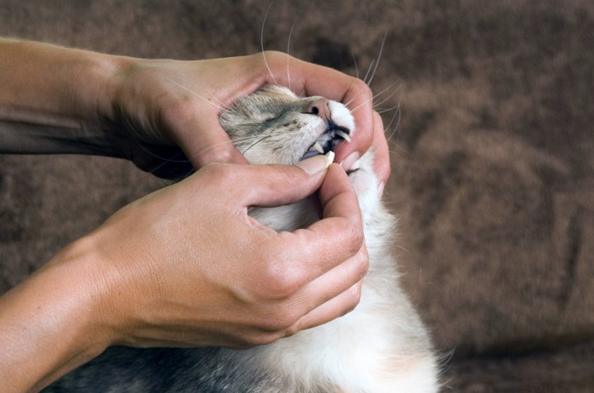 Таблетки можно прятать в корме, но они обладают горьким вкусом, поэтому кошки их часто выплевывают. В связи с этим лучше всего давать препарат принудительно. Для этого таблетки нужно класть на корень языка, удерживая голову питомца приподнятой. Обычно лекарство в этой форме дают и утром, и вечером.
