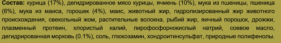 Источников жира здесь два — это животный жир и рыбий жир. В качестве улучшителя вкуса и аромата рациона в продукт добавлены гидролизованные белки животного происхождения. Неясно, от каких видов птиц, животных и рыб они получены.