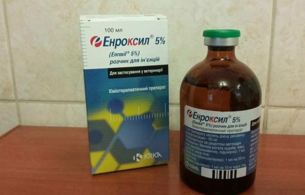 - 5% раствор для инъекций внутрь животного. Главный действующий компонент – энрофлоксацин, а дополнительные добавки – вода, бутанол и гидроксид калия.