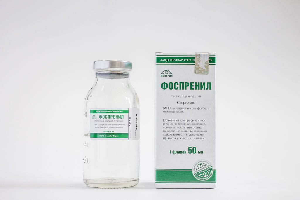 Фоспренил тоже относится к иммуномодуляторам, выпускается в виде раствора для инъекций. Эффективен против ряда вирусных болезней — кальцивироза, ринотрахеита, герпесвируса и других. Применяют его для купирования патологий ЖКТ, перитонита. Подавляет развитие патогенной флоры и способствует восстановлению.