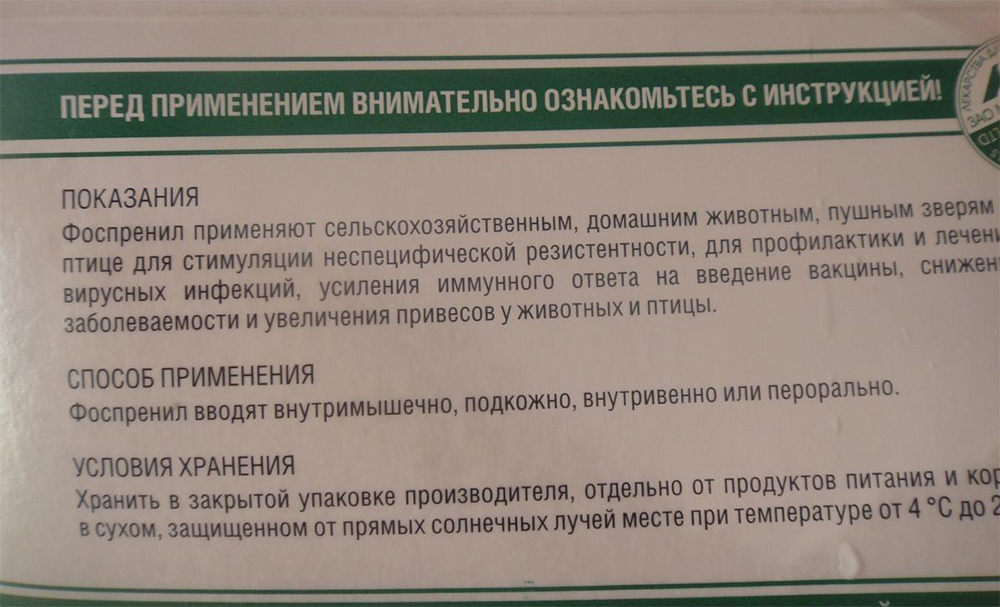 Такая же норма установлена для повышения иммунной реакции на введение различных вакцин. Если производится ревакцинация, то средство не применяют. После профилактического использования фоспренила мясо животных и птиц подлежит кулинарному использованию в пищу без ограничений.