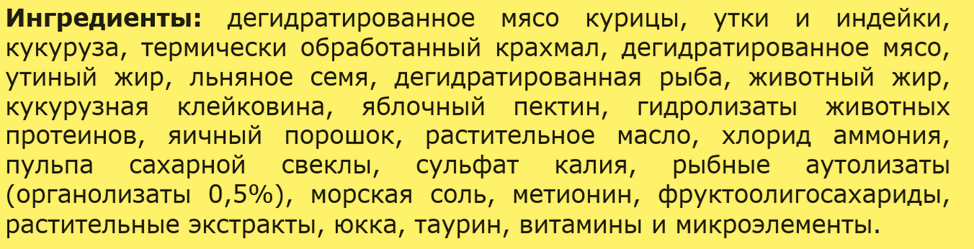 Помимо трех видов птицы фигурируют дегидратированное мясо и рыба. Вероятно, мясокостная и рыбная мука. Термическая обработка модифицирует крахмал, замедляет его расщепление, предотвращает бурное сбраживание. Источник энергии – утиный и животный жиры. Льняное семя образует обволакивающую слизь, которая зачищает стенки желудка и кишечника от агрессивных веществ, поступивших с кормом или образовавшихся в процессе пищеварения. Кукурузная клейковина или глютен – растительный белок среднего качества.