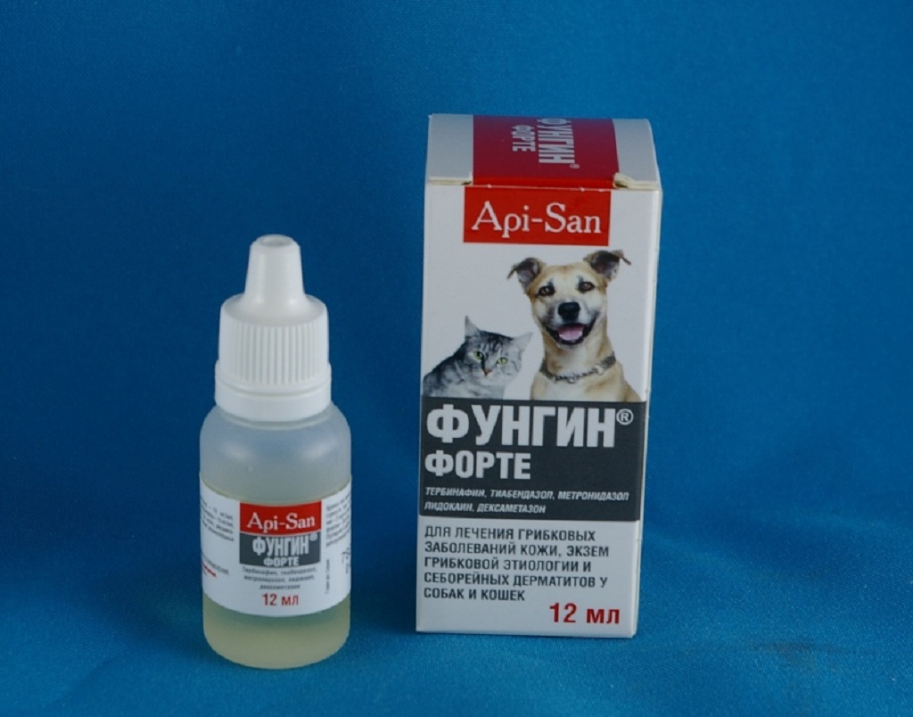 Раствор фунгина форте наносится на пораженное место с помощью предварительно смоченного ватного тампона из расчета 0,2-0,3 мл жидкости на 1 кг живого веса домашнего питомца.