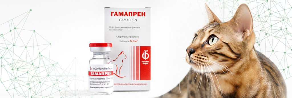 - Гамапрен предназначен для выпаивания. Основной компонент – раствор динатриевой соли фосфата полипренолов. Эффективен при вирусных кошачьих инфекциях (кальцивироз, герпес, ринотрахеит, ринит, стоматит, конъюнктивит и пр.). Лекарство оказывает стимулирующее действие на иммунитет, кожный покров кошки.