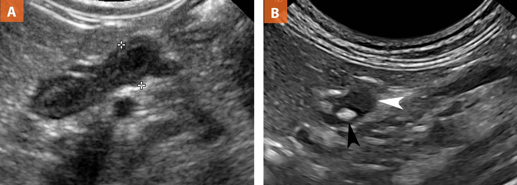 У собак правую долю поджелудочной железы (рис. 12А) легче идентифицировать на основании её большего размера относительно левой доли и близости к нисходящей двенадцатиперстной кишке. Величина поджелудочной железы варьирует в зависимости от размера собаки. В норме проток железы не определяется на УЗИ. Если же проток представлен, то визуализируется в виде двух гиперэхогенных параллельных линий в центре поджелудочной железы.