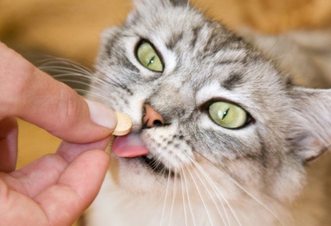 Таблетки можно смешивать с пищей или давать кошке принудительно после предварительного измельчения и растворения небольшим количеством воды. Сделать это можно как при помощи миниатюрного шприца без иголки, так и используя чайную ложку. Главное — как следует держать питомца, чтобы он не вырывался и лекарство случайно не пролилось.
