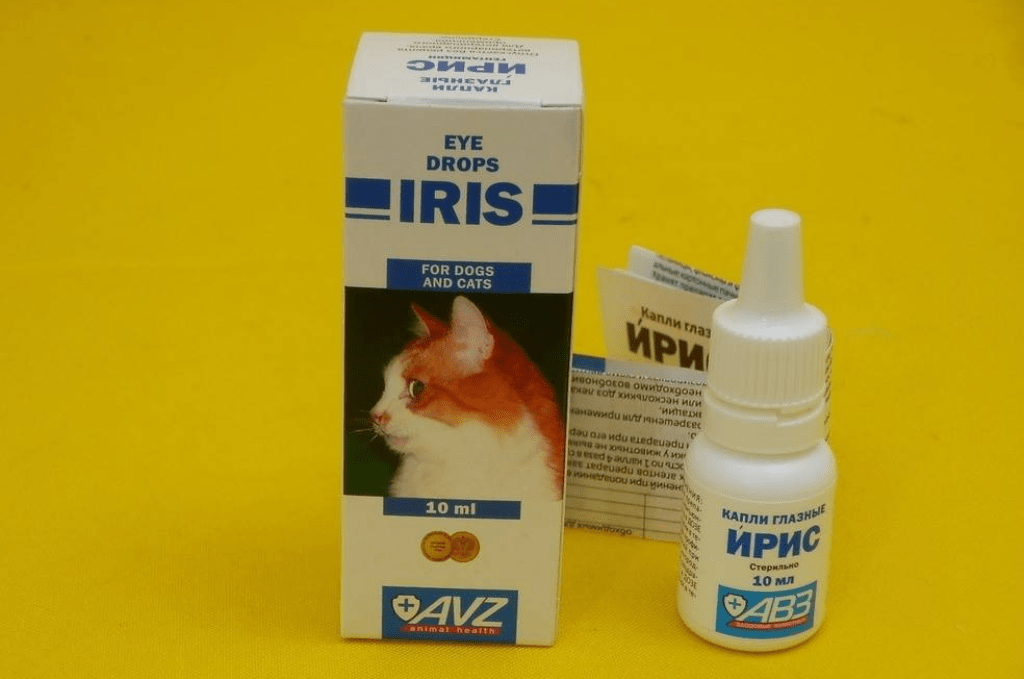 - Глаза кота нужно закапывать офтальмологическими капельками, в составе которых имеется атропин. Также нужны капли с антибиотиком, ветеринары рекомендуют “Ирис”, которых продается в зоомагазинах.