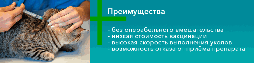 Данная инъекция вводится под кожу кошки в области тела. Процесс может растягиваться на несколько этапов (некоторые препараты вводятся каждые три, четыре или пять месяцев). Первый укол должен проводиться еще до начала течки. После этого процесс повторяется через три, четыре месяца. Дальнейшая вакцинация осуществляется каждые 5-6 месяцев. Это благоприятный режим стерилизации, который не занимает много времени и экономит денежные средства владельцам животных.