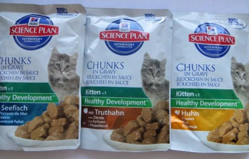Корм «Хиллс» для домашних кошек в паучи представляет собой нечто среднее между сухих продутом и консервами. Это такие аппетитные кусочки в питательном соусе, влажность которых в два раза ниже, нежели в консервах. Один пакетик чаще всего используют для одной трапезы кота. Упаковки могут храниться довольно долго, что считается немаловажным плюсом. Можно заранее купить большую партию и обеспечить своего домашнего любимца вкусной едой на длительный период.