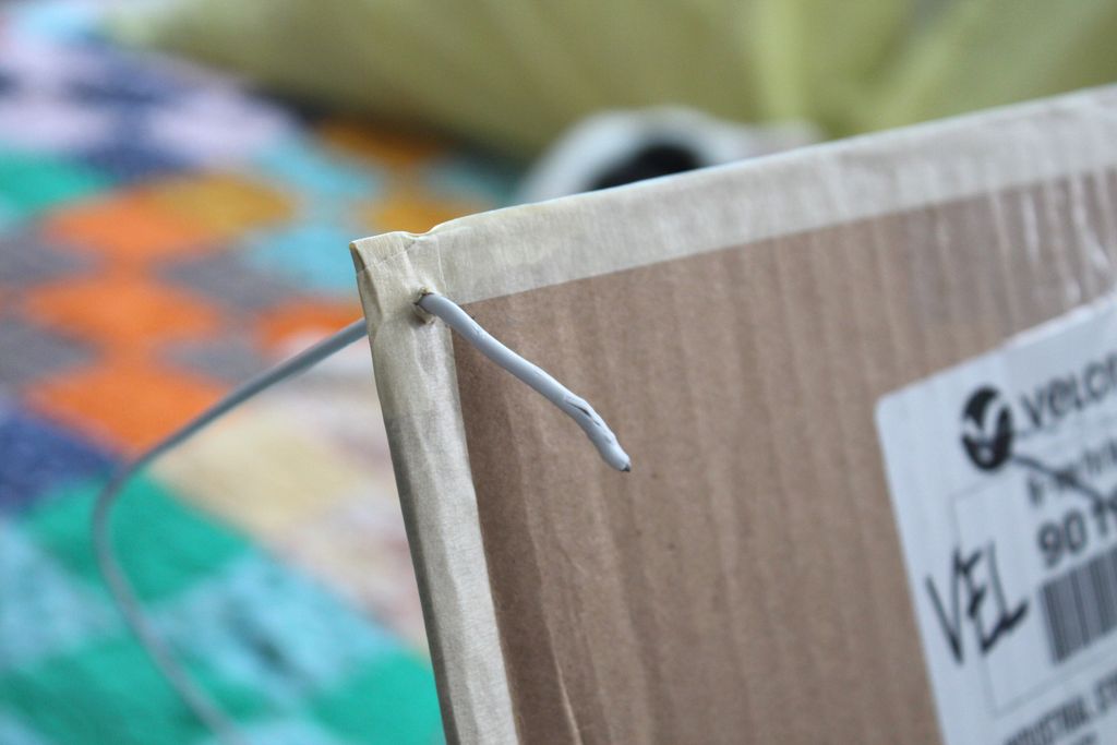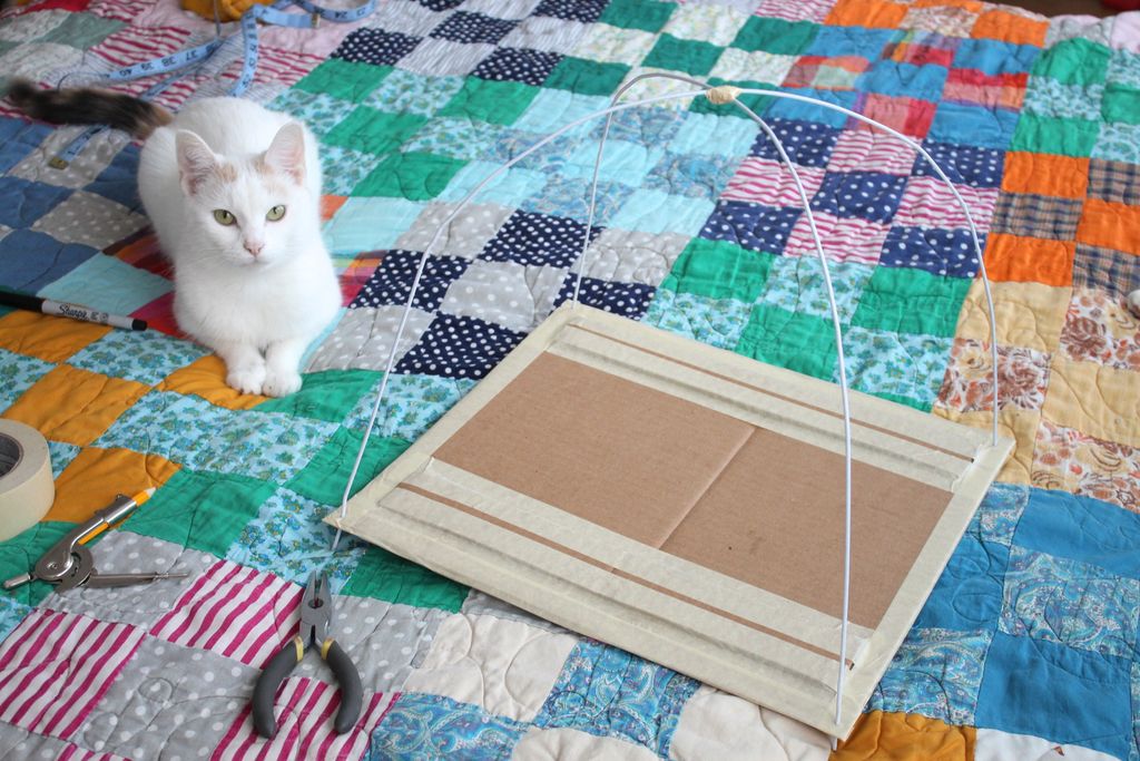 Степлером прикрепить веревку для игрушек к лежанке. На второй конец прикрепить игрушку. Тканью обклеить лежанку, а к низу приклеить ДВП. Обмотать трубу веревкой.