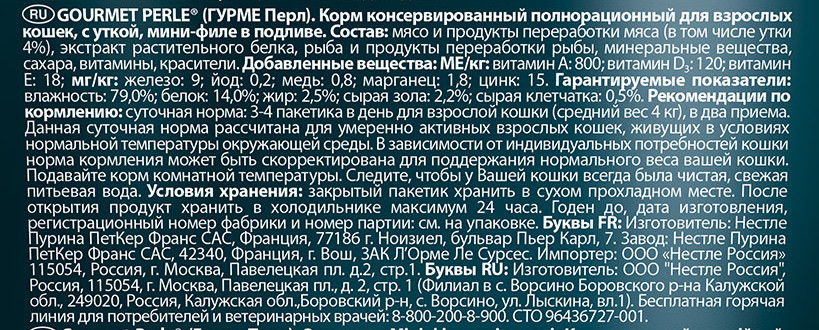 Рассмотрим состав корма для кошек Gourmet на примере варианта «Perle Мини-филе в подливе, с уткой». Посмотреть его состав можно на фотографии ниже, рекомендуем кликнуть по ней чтобы увеличить для удобности чтения: