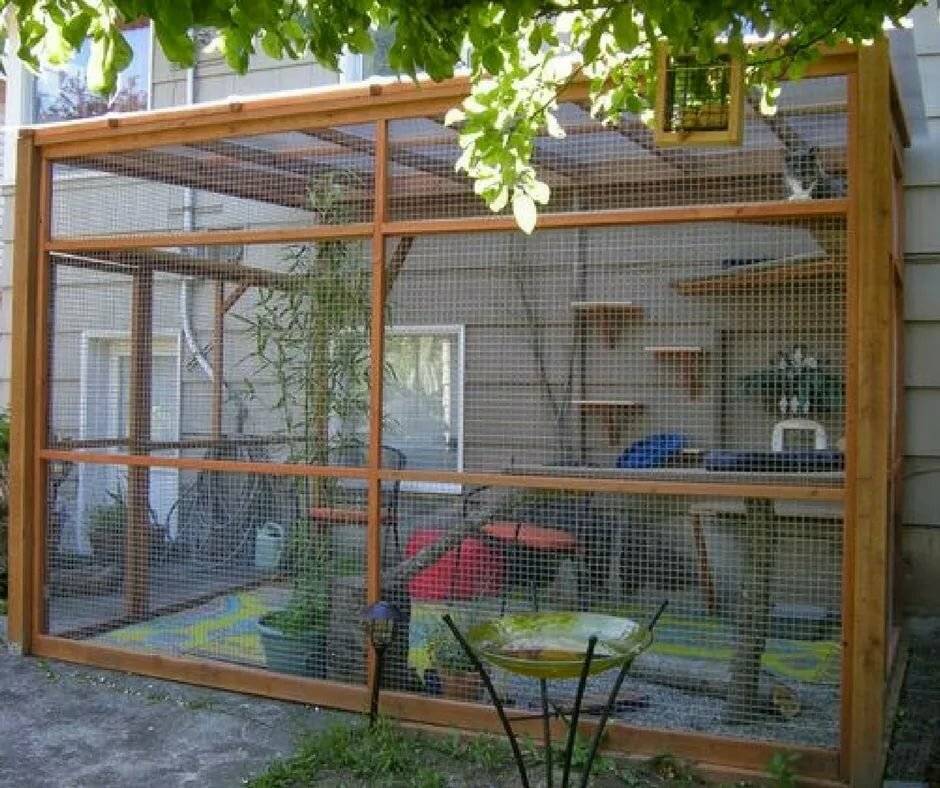 Кошачий вольер – это по сути участок определенной величины, огражденный прутьями или сеткой. Делают его предпочтительно просторным, чтобы у животного было личное пространство. Если вольер оснастить всем необходимым – еда и вода, игровая зона, лежанка и туалет – питомец не будет чувствовать себя «заключенным».