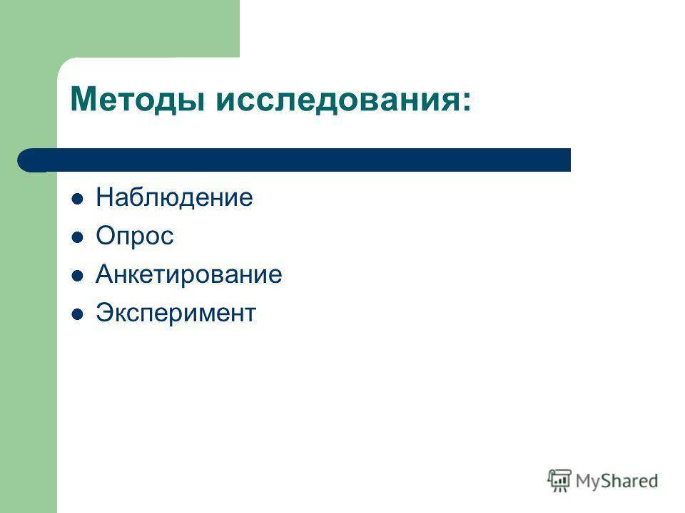 Методы исследования: Наблюдение Опрос Анкетирование Эксперимент