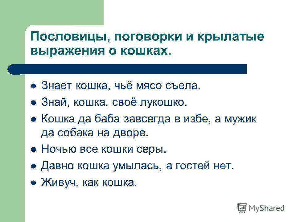Пословицы, поговорки и крылатые выражения о кошках. Знает кошка, чьё мясо съела. Знай, кошка, своё лукошко. Кошка да баба завсегда в избе, а мужик да собака на дворе. Ночью все кошки серы. Давно кошка умылась, а гостей нет. Живуч, как кошка.