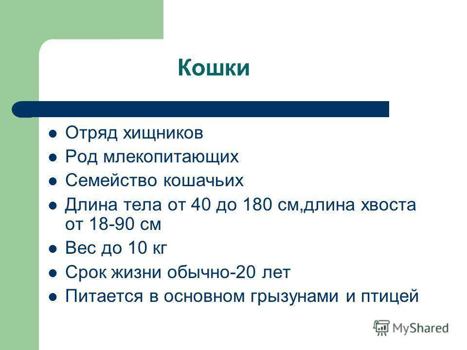 Кошки Отряд хищников Род млекопитающих Семейство кошачьих Длина тела от 40 до 180 см,длина хвоста от см Вес до 10 кг Срок жизни обычно-20 лет Питается в основном грызунами и птицей