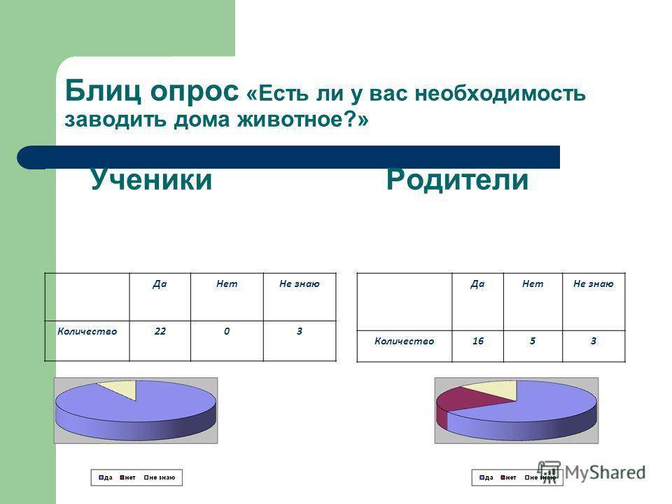 Блиц опрос «Есть ли у вас необходимость заводить дома животное?» Ученики Родители ДаНетНе знаю Количество2203 ДаНетНе знаю Количество1653
