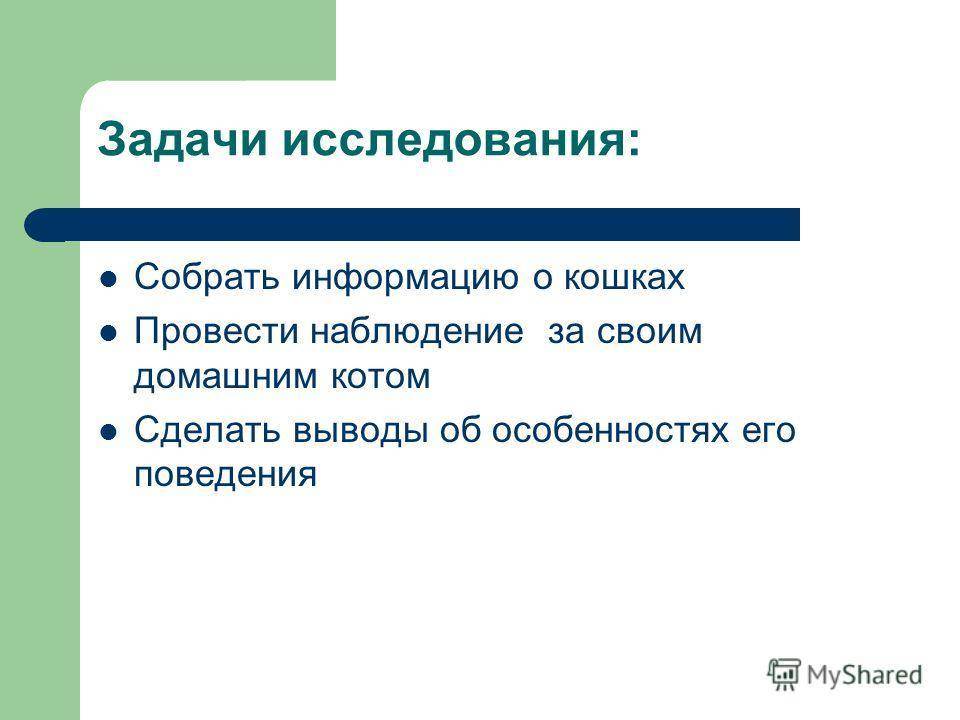 Задачи исследования: Собрать информацию о кошках Провести наблюдение за своим домашним котом Сделать выводы об особенностях его поведения
