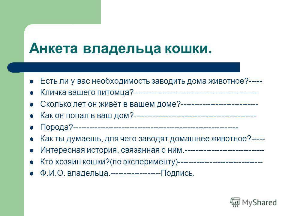 Анкета владельца кошки. Есть ли у вас необходимость заводить дома животное?—– Кличка вашего питомца? Сколько лет он живёт в вашем доме? Как он попал в ваш дом? Порода? Как ты думаешь, для чего заводят домашнее животное?—– Интересная история, связанная с ним Кто хозяин кошки?(по эксперименту) Ф.И.О. владельца Подпись.