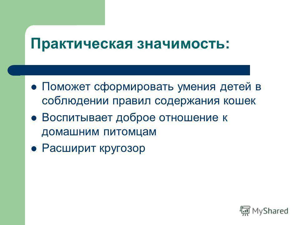 Практическая значимость: Поможет сформировать умения детей в соблюдении правил содержания кошек Воспитывает доброе отношение к домашним питомцам Расширит кругозор