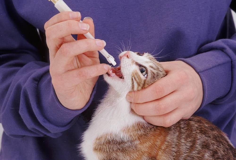 Если врач даёт добро на измельчение таблетки, то её легко можно смешать с водой: обычно используют 2 мл шприц. Полностью препарат не растворяется. Полученную взвесь набирают шприцом без иглы, взбалтывают и захватывают кошку любым удобным способом. В пасть питомицы вставляют наконечник шприца и заводят за щеку, плавно вливая лекарство в рот. Если струя будет резкой, кошка сбежит, не проглотив всю дозу. Поэтому на поршень шприца нажимают плавно, выпуская препарат по капле.
