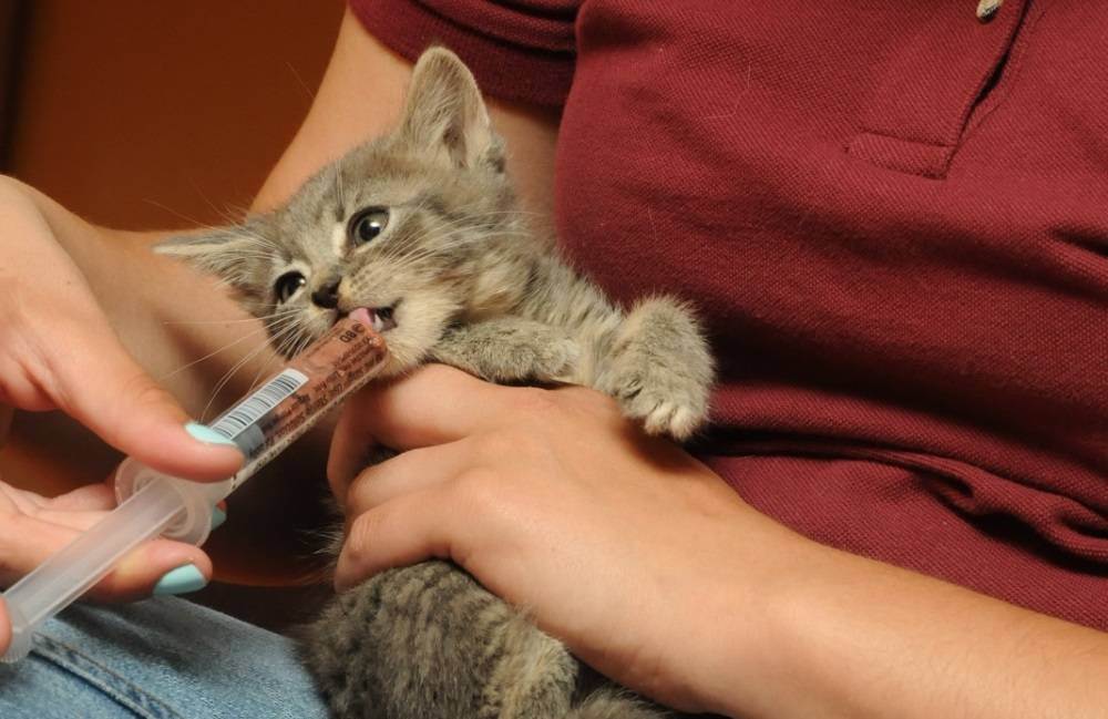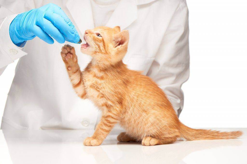 Котёнка держат, закутав в полотенце, и несильно надавливают ему на уголки рта, приподнимая губы. Жидкое средство медленно вливают в пасть шприцом без иглы, а таблетированный медикамент проталкивают ближе к корню языка.